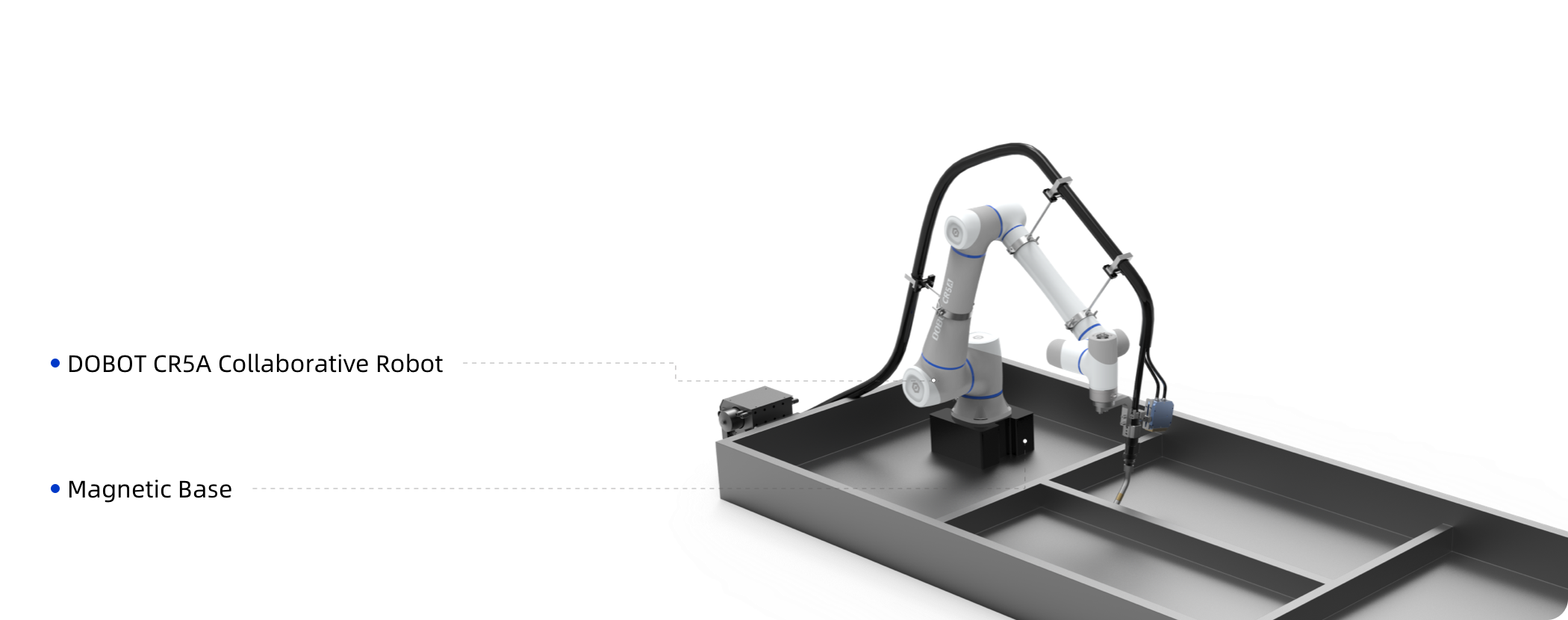 El Dobot CR5A se integra perfectamente con una base de montaje magnética, lo que facilita un rápido reposicionamiento junto a las piezas para tareas de soldadura de alta precisión. Su diseño altamente flexible y compacto lo hace especialmente adecuado para piezas personalizadas de lotes pequeños y con múltiples especificaciones.