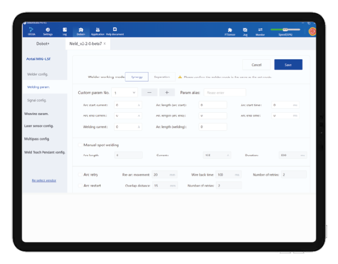 * When performing laser welding or arc welding. It is available to flexibly choose the appropriate communication method with Dobot Welding Process Package.